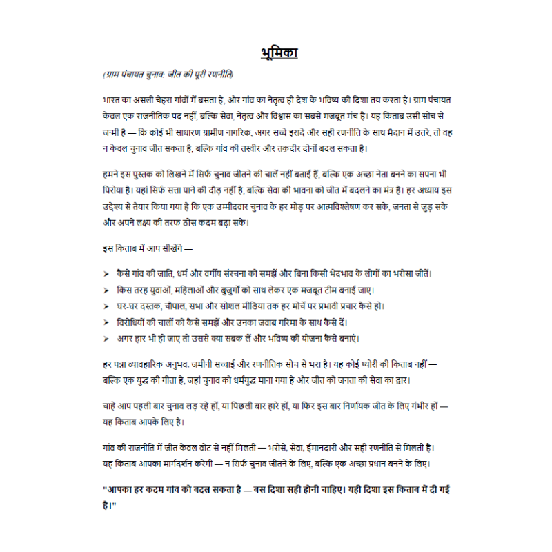 💡 यह किताब उन लोगों के लिए है जो सिर्फ चुनाव लड़ना नहीं, बल्कि जीतकर अपने गांव में बदलाव लाना चाहते हैं।